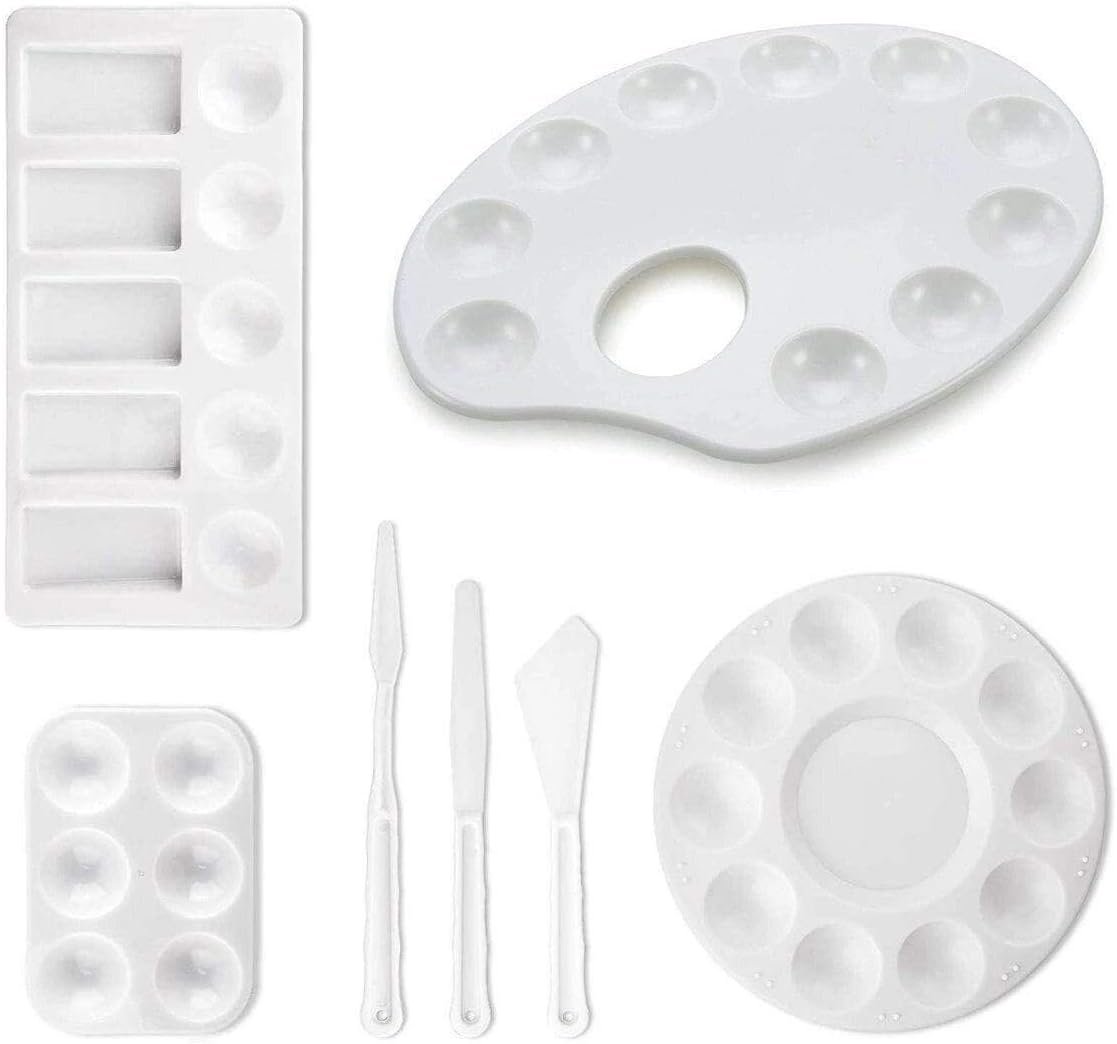 • Palette set includes 4 Plastic palettes and 3 plastic painting/palette knives