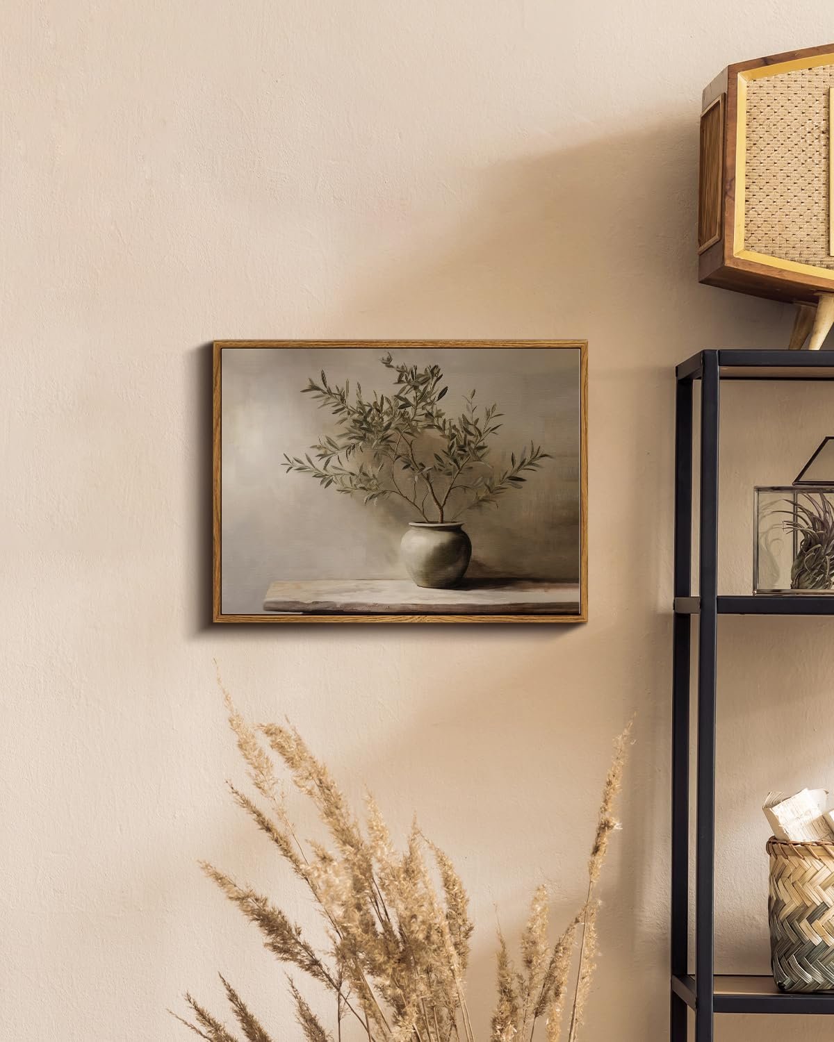 - ELEGANT STILL LIFE DESIGN: This framed wall art showcases a simple yet sophisticated still life composition with an olive branch in a rustic ceramic vase, perfect for adding a touch of natural charm to any room. The wall decor artwork is rich in detail, from the delicate textures of the olive leaves to the rustic finish of the ceramic vase, demonstrating the artist’s meticulous craftsmanship.