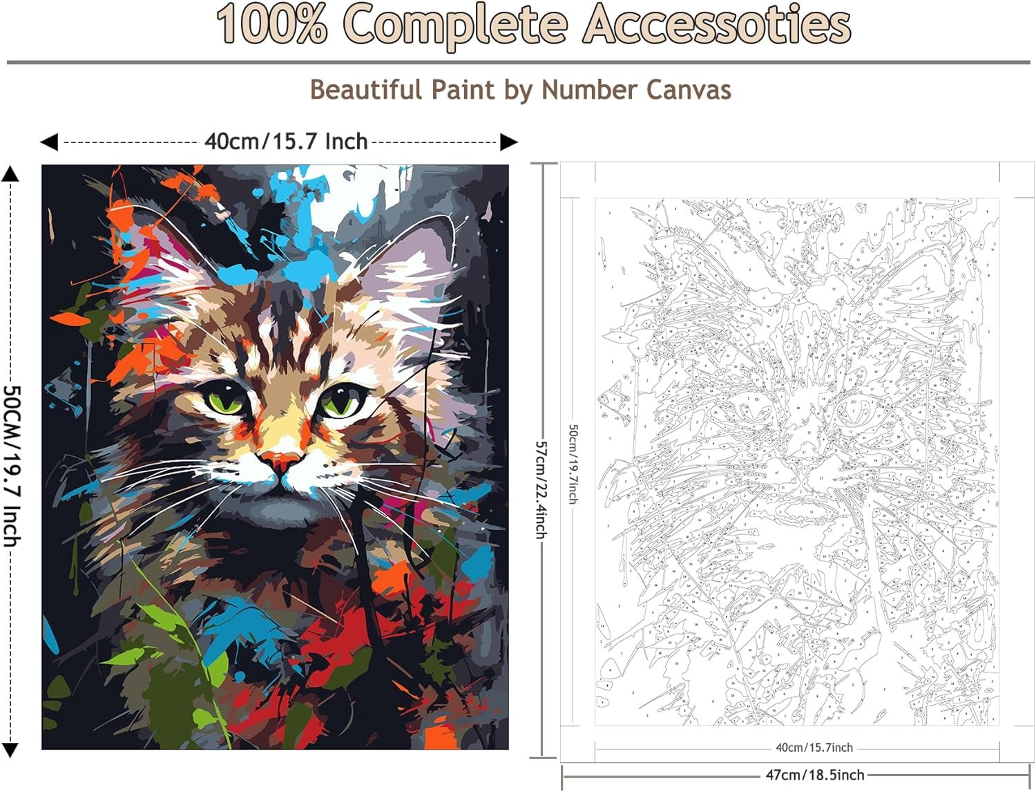 • 🖤【What Will You Get】: The DIY yellow cat paint by numbers includes 16″X20″ canvas with a numbered sketch(without frame), 3 different size brushes, 2 metal hooks and screws.